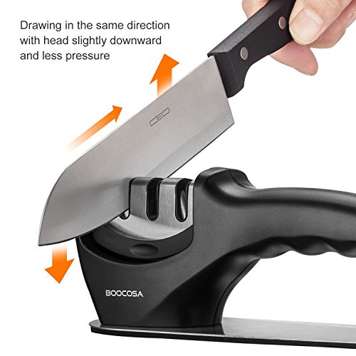 We made this knife sharpener to give the easiest time when sharpening your knives. It has a solid ABS body and an ergonomic handle that ensures you are not straining as you sharpen your knives. If that is not all, a non-slip rubber base keeps in conveniently in place, eliminating all frustrations that come with standard knife sharpeners.