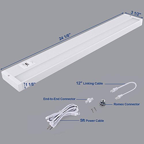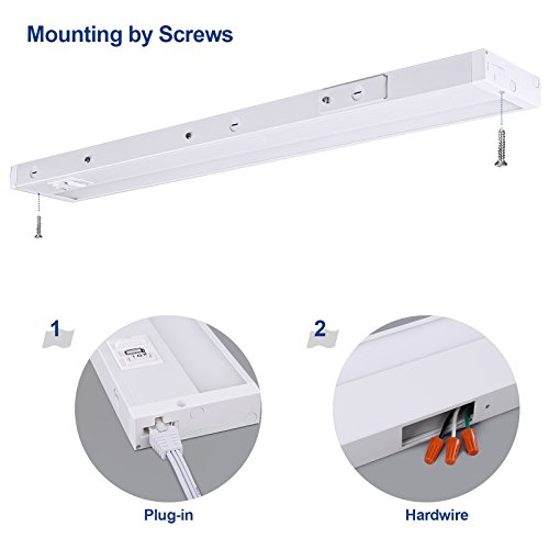 Installation is quite straightforward as each fixture only need 2 screws to fix it to the underside of the cabinet. Simply plug the light fixture to a power supply with 5ft 3-grounded power cable or hardwire it to a wall switch for convenient control, and you can expand one or more fixtures with end-to-end connector or use the 12'' linking cable to spread them out, all accessories included.