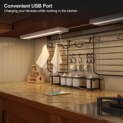 This under cabinet light is 1 1/8" slim design, low profile and hidden well. Energy saving LEDs, heat eliminable aluminum alloy shell, great replacement to your halogens and fluorescent fixtures, low power consumption with no bulbs to replace. There is DC5V 2A USB port output for charging or USB devices working, which offering more convenience and entertainment to your kitchen tasks.