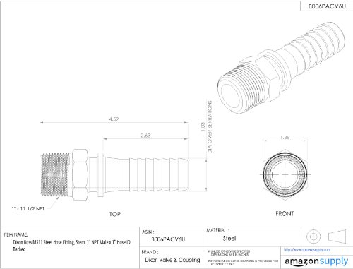 This Dixon Boss MS Series stem hose fitting is made of plated steel and connects hose to a female NPT threaded connection. It has a barbed end to create a tight seal on a hose when used with a Boss clamp (not included) and male National Pipe Taper (NPT) threads on the other to connect to female NPT threaded connections. This Boss stem hose fitting is made of plated steel for greater corrosion resistance than unplated steel, and it has a Klingersil C-4401 nitrile, rubber bonded, non-asbestos washer for high heat resistance, chemical stability, high torque retention, and reduced turbulence.