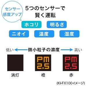 高感度センサー・PM2.5モニター搭載 従来品より感度をアップしたホコリセンサー、明るさ、ニオイ、湿度、温度の5つのセンサーで賢く運転します。花粉などの大きな粒子に加え、微小な粒子まで検知。 PM2.5などの微小な粒子の濃度(目安)※を当社独自のアルゴリズムで判別し、わかりやすく色でお知らせ。濃度が高い時は、風量を強めて集じんします。 ※環境省大気汚染物質広域監視システム(そらまめ君)と当センサーの測定結果をもとにシャープ独自のアルゴリズムでPM2.5相当の濃度を判別しています。PM2.5モニターはあくまでも目安です。 |