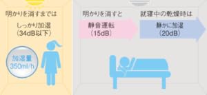 「静か寝」運転で「うるおい」&「静音」で快適睡眠 明かりを消すまではしっかり加湿。明かりを消すと自動で約15dBの静音運転に切り換わり、センサーがお部屋の乾燥を検知すると静か(約20dB)に加湿してお部屋を快適に保ちます。 |