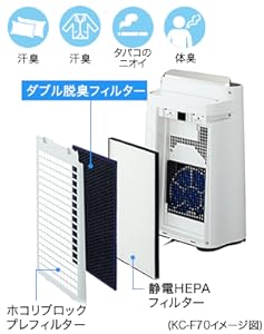 汗臭などを吸着する、ダブル脱臭フィルター 従来の活性炭に吸着剤を加えて、効果が長持ちする脱臭フィルターは、10年間交換不要※です。 ※ 日本電機工業会規格(JEM1467)に基づく試験方法により算出。1日にタバコ5本吸った場合の目安。ニオイの種類・強さや使用状況によっては、ニオイが取れにくくなり、お手入れや交換が必要になる場合があります。 |