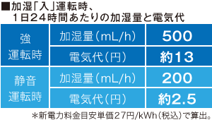 少ない電気代でたっぷり加湿 たっぷり吸い上げて含んだ水を低風量で気化する素材を使用することで、少ない電気代でたっぷり加湿を実現。1日24時間使い続けても気にならない電気代です。 |