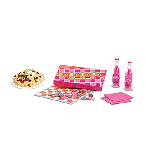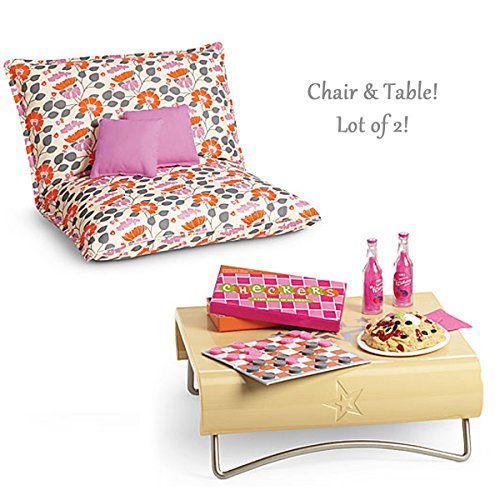 Studio : American Girl Publisher : American Girl Binding : Toy Product Description Brand New in American Girl Boxes! Lot of 2! Cozy Lounge Chair Fun Games Table! Fun Games Table: Item# F3607: Get set for giggles and girl time with this fun set! It includes: A table set low to the floor-perfect for playing games! A checkers board and 24 pink and gray checkers your girl can really play with, plus game instructions that store inside the game box. Pretend snacks and supplies for sharing: a nacho plate, two wild-berry drinks, and two paper napkins. Cozy Lounge Chair: Item# F3604: This lounge chair has a sturdy frame inside the soft, blossom printed cushion. It's perfect for sleepover fun-use it as a seat when they're playing games, then fold it down to use as a futon! Includes two pink pillows to match 0