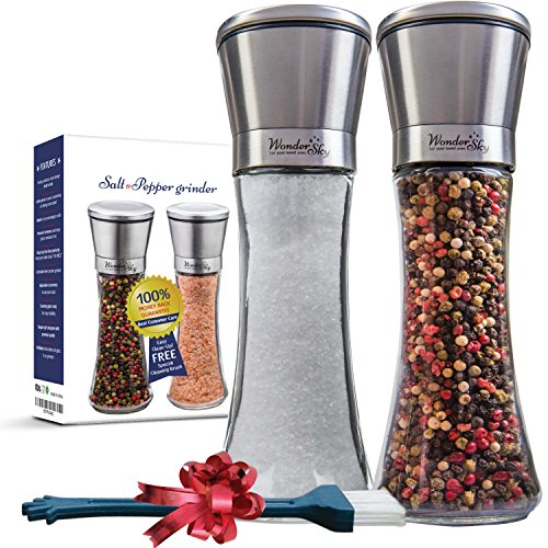 Salt and Pepper Shakers Grinders Set of 2 Glass Mills Brushed Stainless Steel with Adjustable Ceramic Rotor and Utility Brush by Wonder Sky