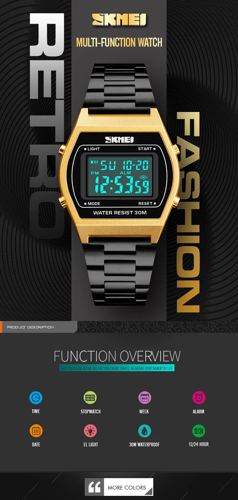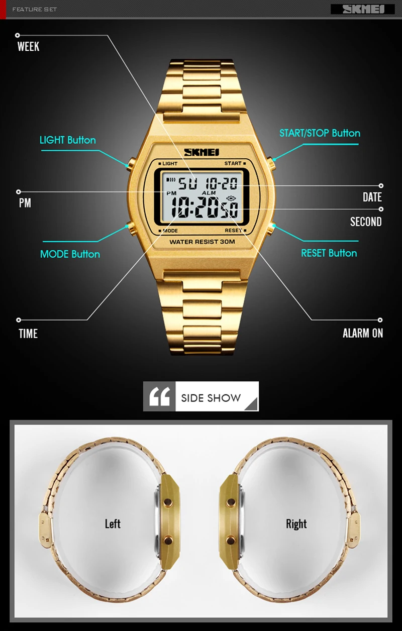 Feature:Auto Date,Shock Resistant,Week Display,Water Resistant,Stop Watch,Chronograph,Back Light,LED display,Repeater