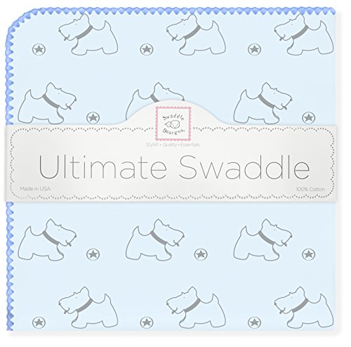 SwaddleDesigns Ultimate Swaddle Blanket, Made in USA, Premium Cotton Flannel, Gray Doggie with Blue Trim