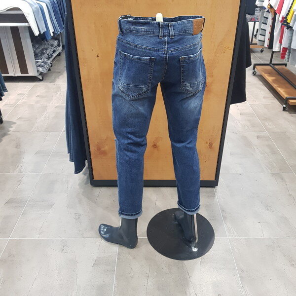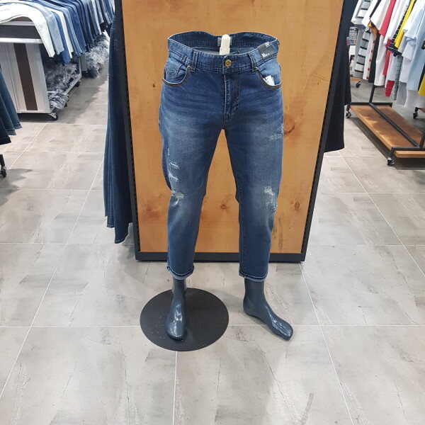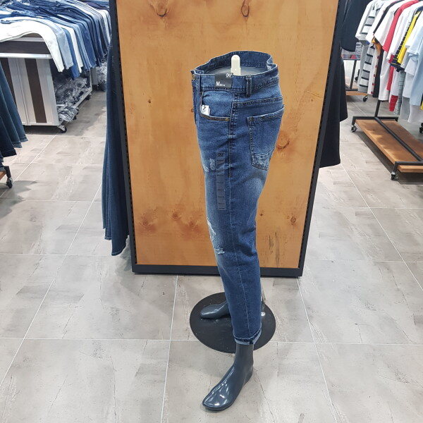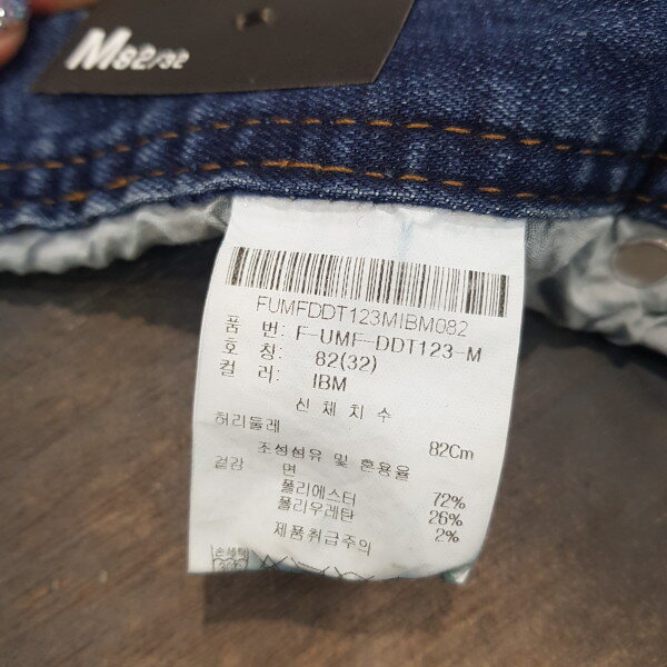 M톤의 구제 데님. 작은 구제 및 지그재그 자수들이 불규칙적으로 배열된 비티지 무드의 스타일리쉬 아이템