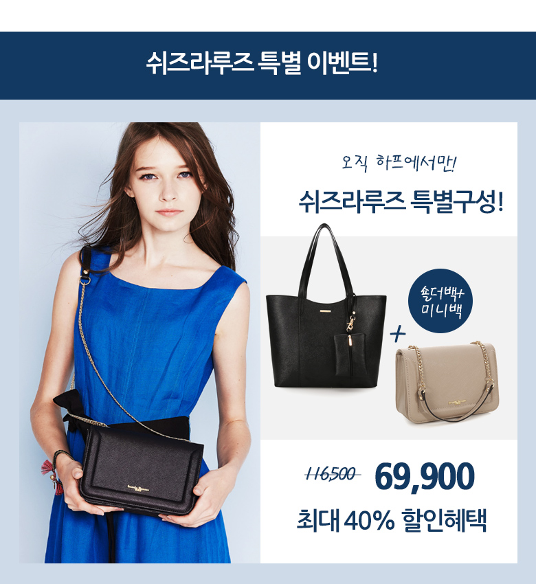 견고한 합성피혁소재를 사용하여 광택감과 재질감이 고급스러우며 쉬즈라루즈의 이니셜로고가 포인트로 밋밋하지 않게 포인트로 장식되어져있습니다.
