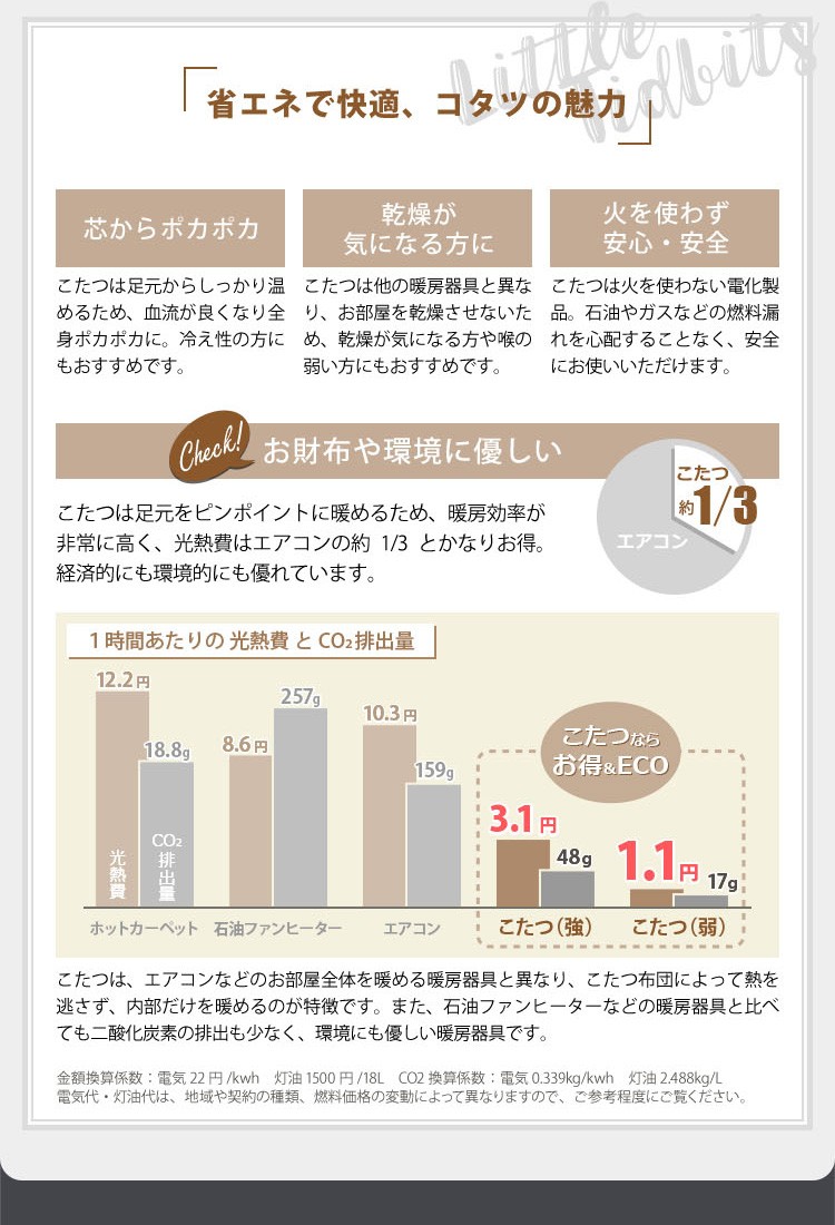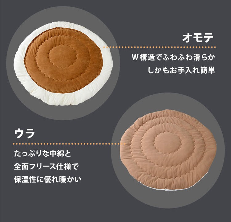 こたつ布団:側生地:表地、裏地・コーナー部:ポリエステル100% 詰め綿:ポリエステル100%(重量118g)