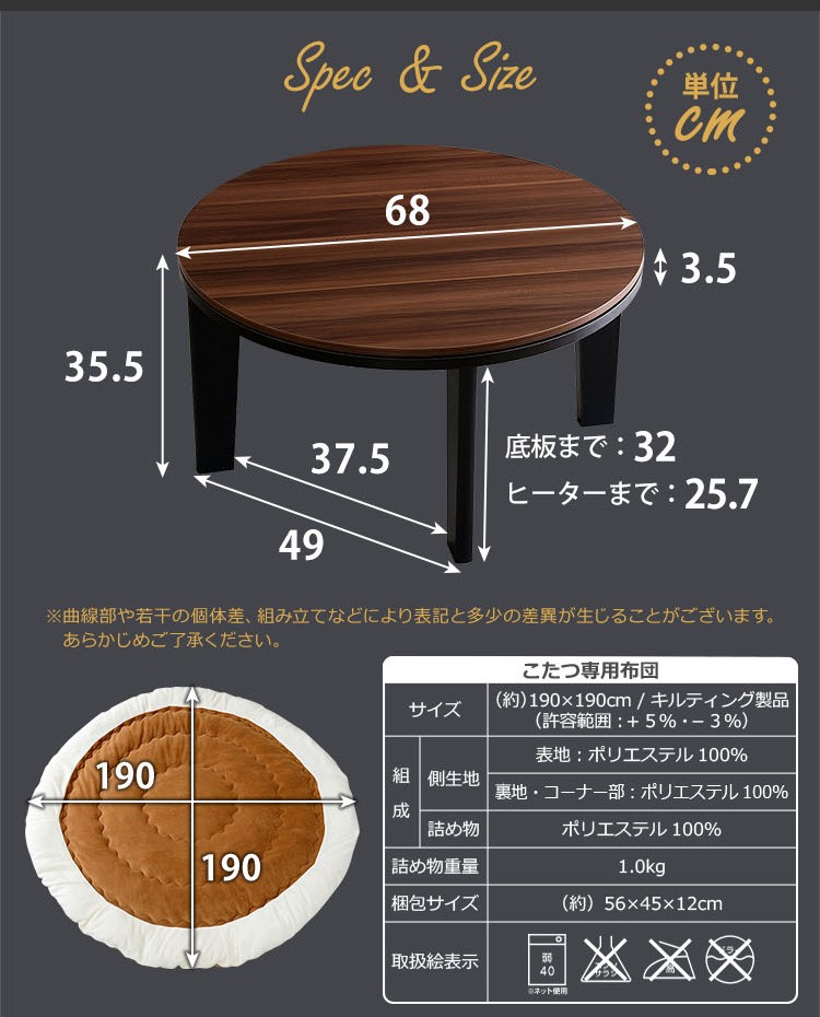 こたつ本体:直径68×高さ35.5cm こたつ布団:直径190cm(許容範囲+5%・-3%)