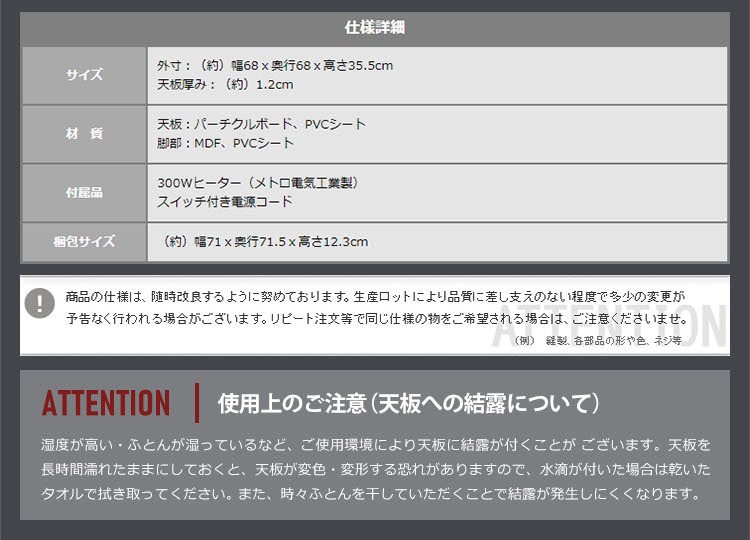 【梱包サイズ】こたつ本体:71x71.5x12.3cmこたつ布団:約56×45×12cm