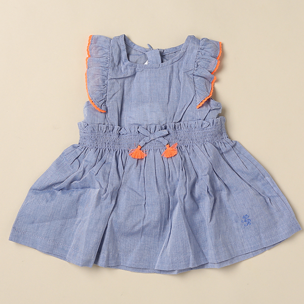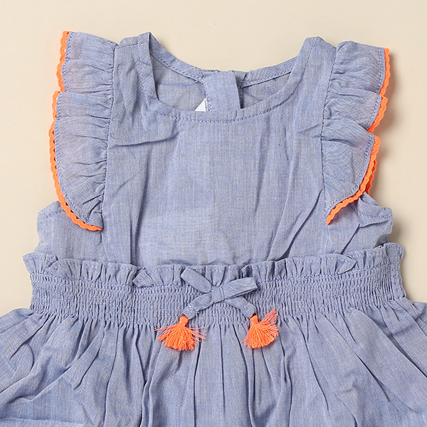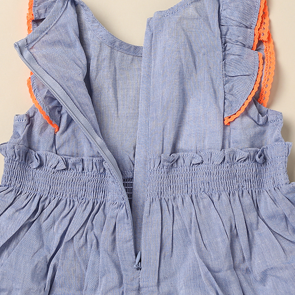 오렌지색상의 포인트가 귀여움을 더 자아내고 어깨선의 프릴소매가 여아스러움을 돋보이게 합니다