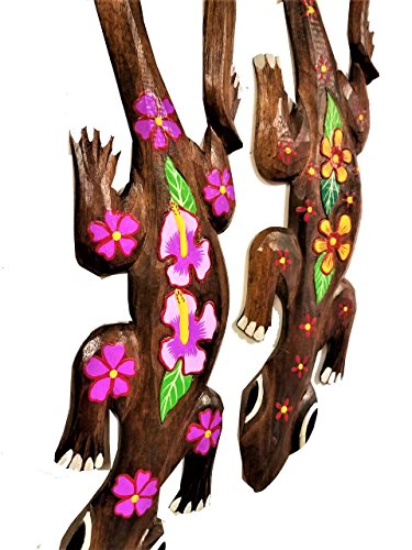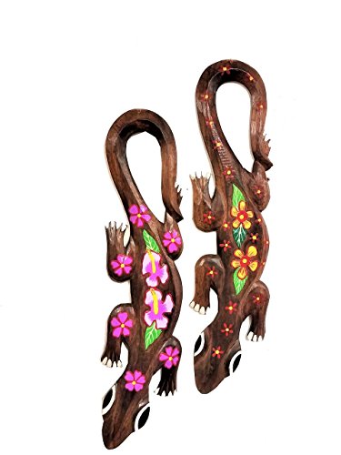 SET OF (2) HANDCARVED CUSTOM WOOD GECKOS WITH COLORFUL FLOWER DESIGN WALL DECOR WITH WALL HANGER