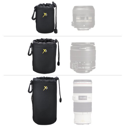 Protect all of your camera lenses with these lens pouches . Water resistant neoprene provides excellent durability; Set of 3 : Small 5", Medium 6", Large 8" . Clip - allows you to attach the pouch anywhere (such as camera bags and backpacks)