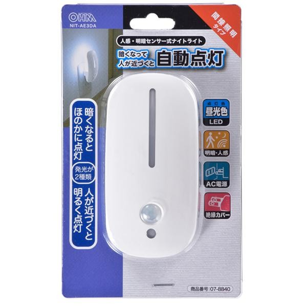 センサーモードと常時点灯の切替可能なLEDナイトライトです。コンセントに差し込むだけの簡単設置!! 製造国:中国 ※サプライヤー直送品 ご注文後2~3営業日後の出荷となります【商品名】オーム電機 OHM LEDナイトライト 人感・明暗センサー 昼光色LED NIT-AE3DA