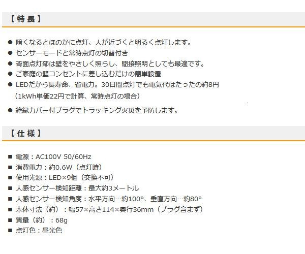 センサーモードと常時点灯の切替可能なLEDナイトライトです。コンセントに差し込むだけの簡単設置!!