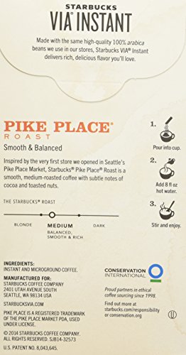 Starbucks VIA Ready Brew Pike Place Roast. In 1971 we opened our first store in Seattle's Pike Place Market. Reflecting on our heritage inspired us to create this delicious blend with smooth body and subtle flavors of cocoa and toasted nuts. Brewed fresh every day in our stores, it's a rich, satisfying and balanced cup.Feature