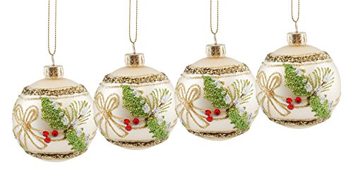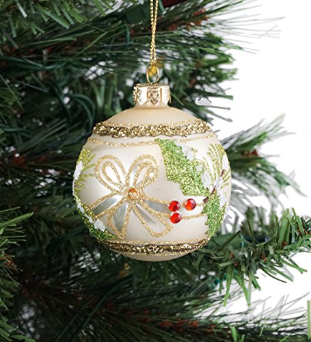- Features a set of ivory ball ornaments with a glitter gold-colored trim, holly leaf design with a bow accent