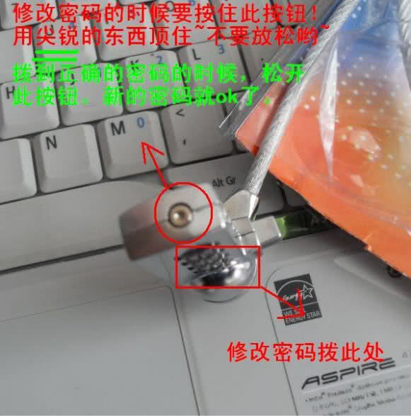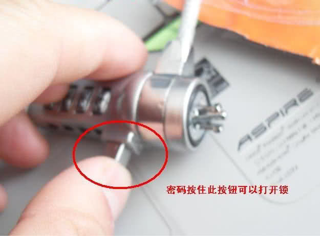 密码锁设置:如果需要更改密码,使锁处于开锁状态(原始密码为0000,或您已经设置过的密码)按住锁头底部的一个小按纽(可以用尖头的工具按下去),开始调节密码.密码调好后,放开按纽(注意,设置密码时按住底部的小原点一定不要松开,设置完毕后松开即可,密码可以先给为0001、0002即便是忘记了或操作失误也方便找回)