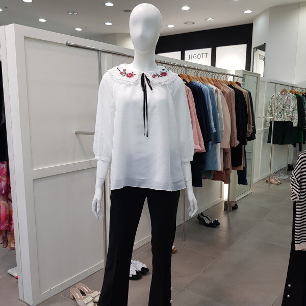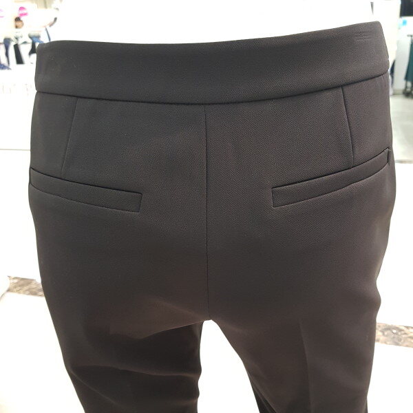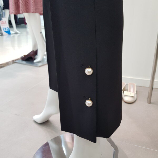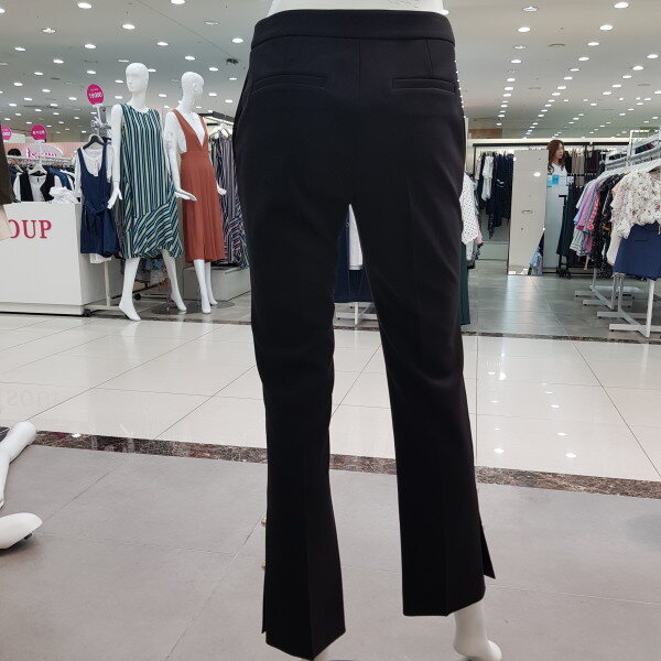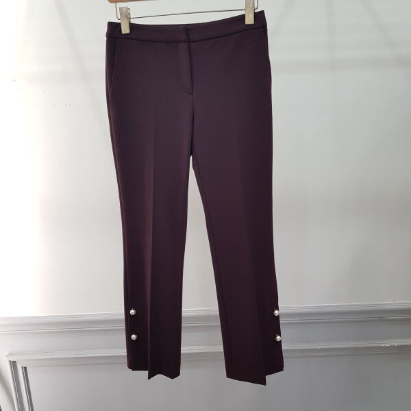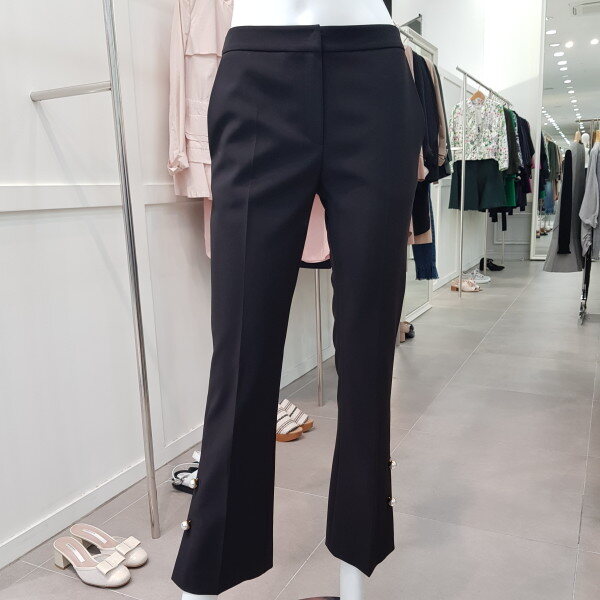 바지 밑단의 진주로 포인트를 준 부츠컷팬츠. 신축성이 좋아 활동성이 좋은 편안한 아이템.