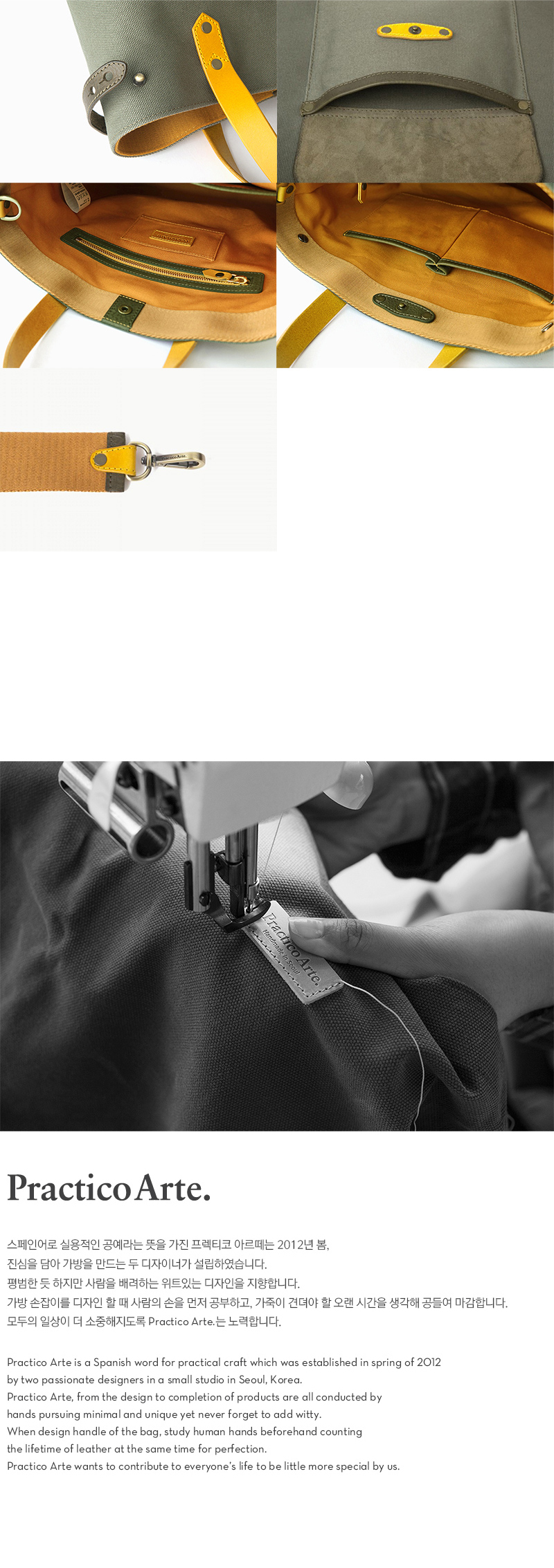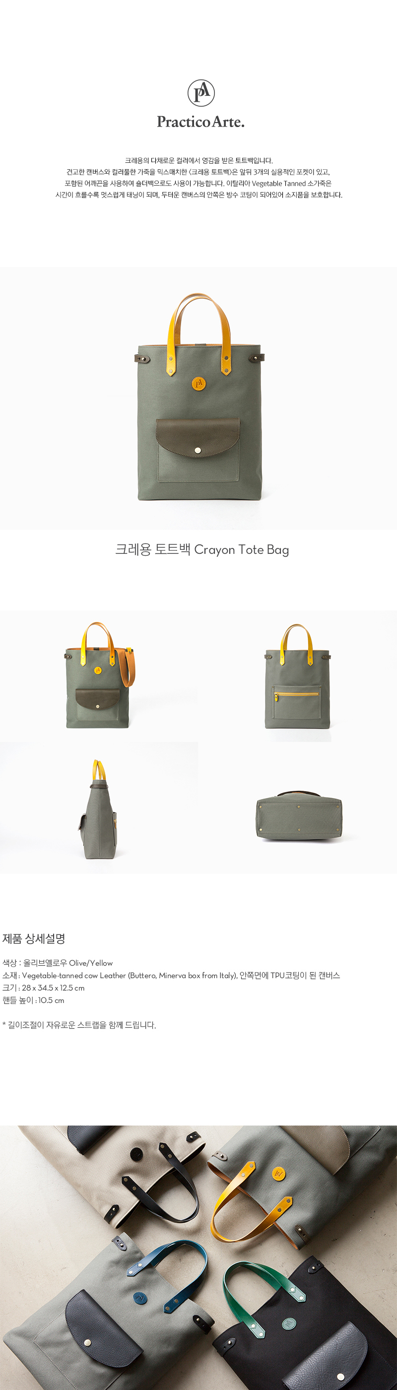 견고한 캔버스와 선명한 옐로우컬러 가죽을 믹스매치한 <크레용 토트백>은 앞뒤 3개의 실용적인 포켓이 있고, 조절가능한 어깨끈을 사용하여 숄더백으로도 사용이 가능합니다.