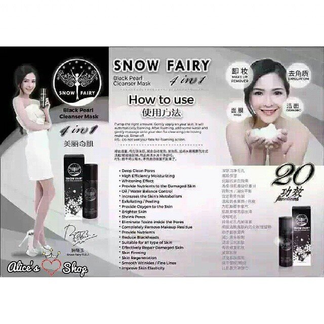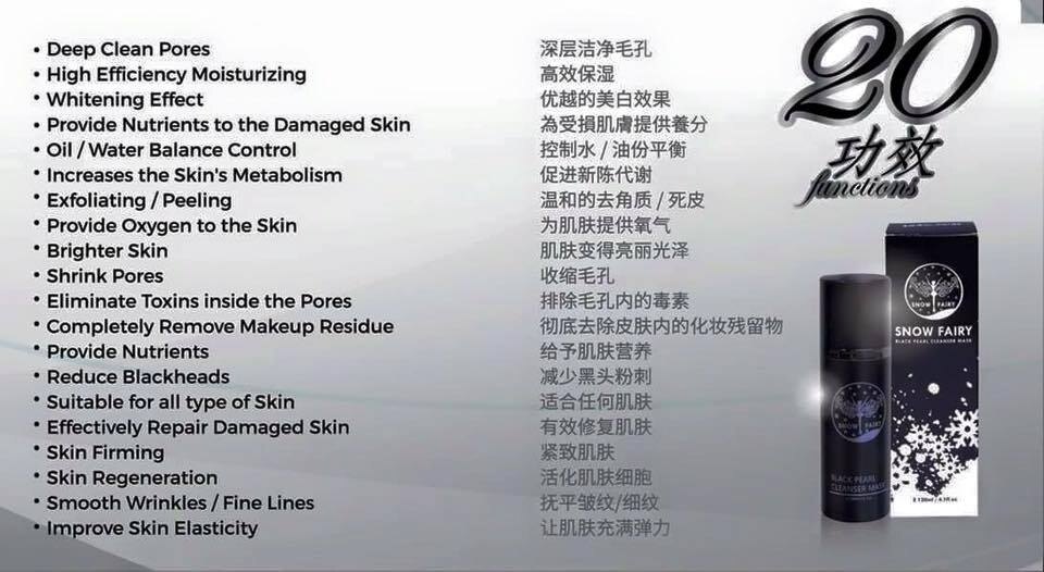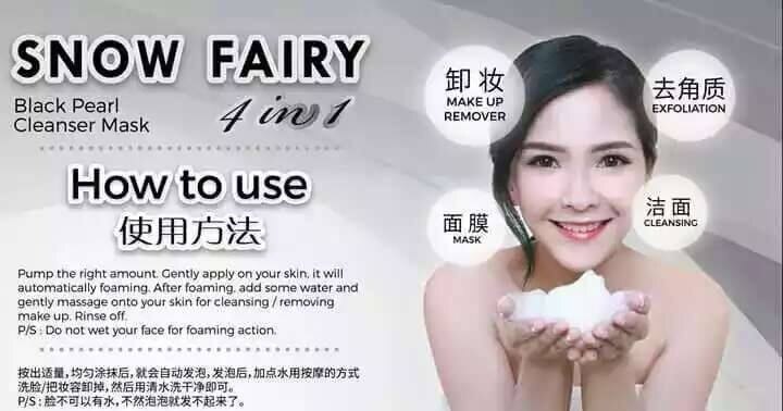 SNOW FAIRY 4 in 1 Black Pearl Cleanser Mask with 4 in 1 benefit in one product! Using the SNOW FAIRY 4 in 1 Black Pearl Cleanser Mask you can Remove makeup + Cleanse + Mask + eExfoliating at the same time! SNOW FAIRY Cleanser Mask save your precious time and money!
