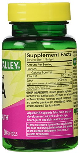 -. Binding : Health and Beauty -. Brand : Spring Valley -. EAN : 0681131312653 -. Feature : Algal Omega-3. / DHA 200 mg per Softgel. / Supports Prenatal Health. / 30 Softgels. -. IsAdultProduct : 0 -. Label : Wal-Mart Stores, Inc. -. LegalDisclaimer : The statements in this page have not been evaluated by the Food and Drug Administration. This product is not intended to diagnose, treat, cure or prevent any disease. -. Manufacturer : Wal-Mart Stores, Inc. -. PackageQuantity : 1 -. ProductGroup : Health and Beauty -. ProductTypeName : HEALTH_PERSONAL_CARE -. Publisher : Wal-Mart Stores, Inc. -. Studio : Wal-Mart Stores, Inc. -. Title : Spring Valley - DHA 200 mg, Plant-Pure Omega-3, 30 Softgels -. UPC : 681131312653