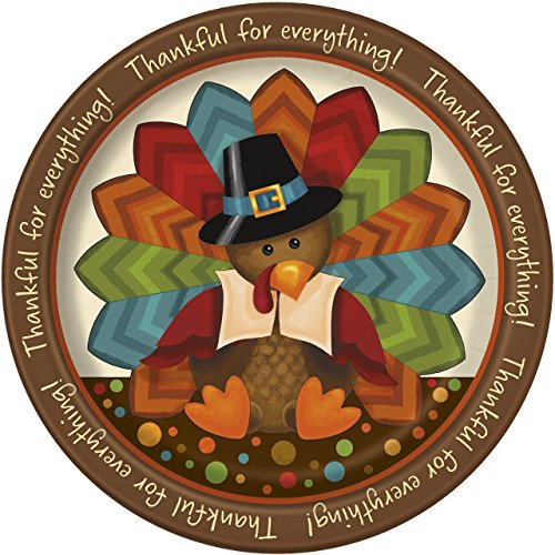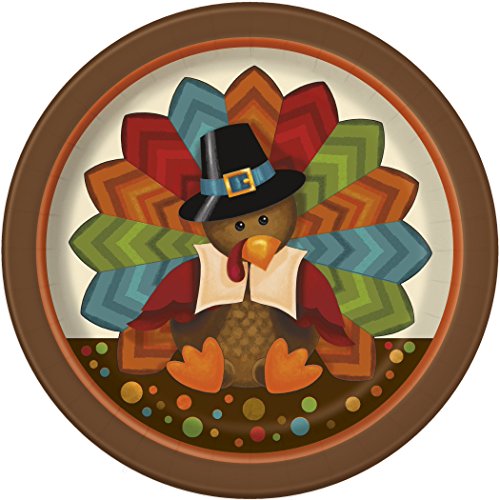 ? (8) 9" round dinner plates ? (8) 7" round dessert plates ? (16) lunch napkins ? (1) Thanksgiving themed activity tablecover Colors include red, orange, green, blue, brown.