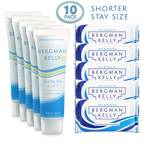 MAKE YOUR GUESTS FEEL AT HOME- The lightly white tea scented Bergman Kelly hotel 2in1 shampoo & conditioner and soap bundle packs perfect for your travel guests, and is a classic amenity for your hospitality bathroom.