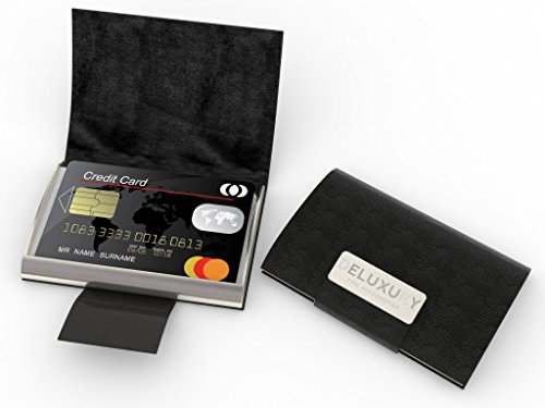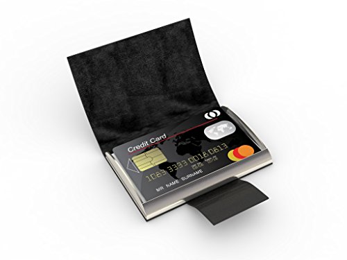 SAFE AND SECURE: protects your credit and business cards in a stainless steel case bound in stylish black leather grain held with a magnetic clasp to hold the cover closed from accidental opening