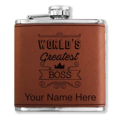 -. Binding : Kitchen -. Brand : SkunkWerkz -. Color : Dark Brown -. EAN : 0648499658687 -. Feature : Flask is laser engraved with the image that you see in the photo. Your name or personalized message will be engraved below the image for FREE. / Measures 4.25" tall and 3.75" wide. Holds 6 fluid ounces / Constructed of stainless steel with a synthethic rawhide leather wrap. / You may have one line of engraved text - 20 characters maximum. / Click the "Customize Now" button to begin customizing your flask. -. ProductGroup : Kitchen -. ProductTypeName : KITCHEN -. Title : Faux Leather Flask - World's Greatest Boss - Personalized Engraving Included (Dark Brown) -. UPC : 648499658687