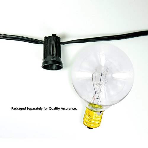 - SATISFACTION GUARANTEED - Fulton Illuminations stands behind all of our products 100%. String lights come with a 1 year warranty and you can register online for a FREE LIFETIME WARRANTY. If anything goes wrong with your purchased product (except the bulbs), we will replace it with a new item. 25 Sockets, 30 Bulbs, Bulb Spacing: 1 Foot, 5 Watt per bulb, 125 Watt per string, 120 Volt, 20 AWG, Fits E12 & C7 Sockets, Clear Glass Globe Bulbs