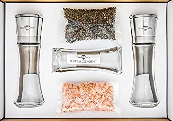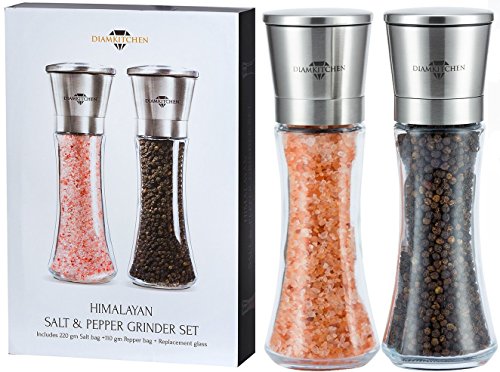 Salt & Pepper Grinder Set By DIAMKITCHEN - Stainless Steel Spice Mill Pair With BONUS: Replacement Glass + 110gr Black Pepper + 220 gr Himalayan Salt- Set Of 2 Handheld Grinder Set With Ceramic Blades