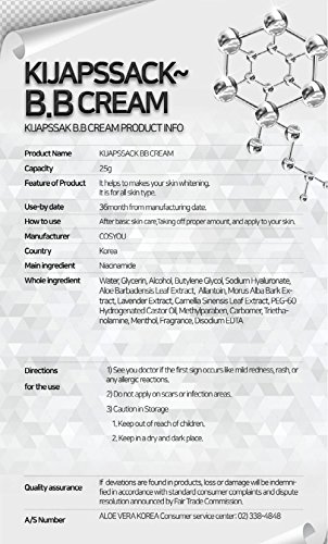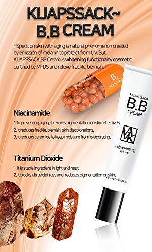 -. Feature : KIJAPSSAK BB CREAM is a whitening functional cosmetics that covers Blemish, spot, Freckles. Certified by the Korea Food and Drug Administration / Contains Niacinamide, which reduces pigmentation of the skin, helps prevent Skin aging and reduces Blemish & Freckles, wrinkles and skin discoloration / Ceramide, which prevents evaporation of fat and moisture, suppresses wrinkles / Titanium dioxide, which has excellent stability to light and heat, blocks ultraviolet rays and reduces the deposition of skin pigment / It is easy to use after foundation makeup and skin cream