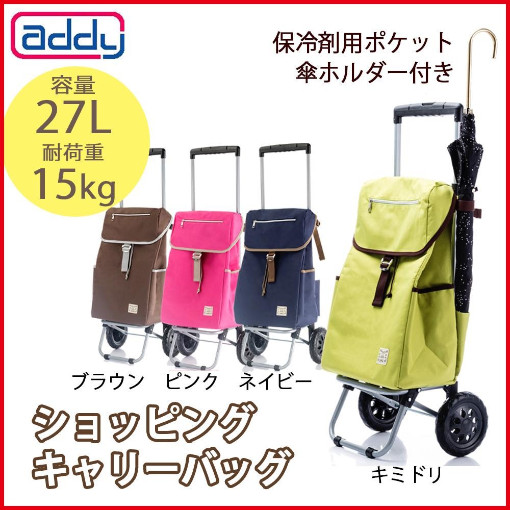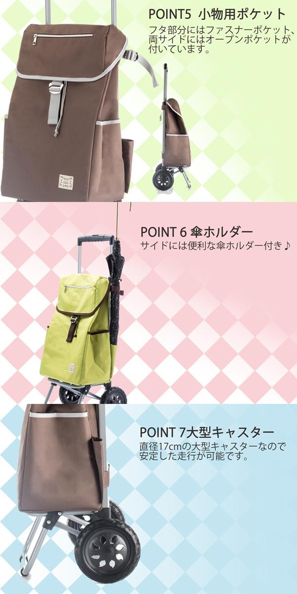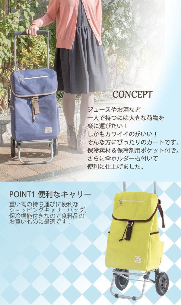 | 折りたたみ式キャリーカートとポリエステルバッグがセットになったオシャレなショッピングキャリー☆内装には保冷素材を採用。また、保冷剤用のポケットもあるのでお買い物に便利です。傘ホルダー付き♪ |