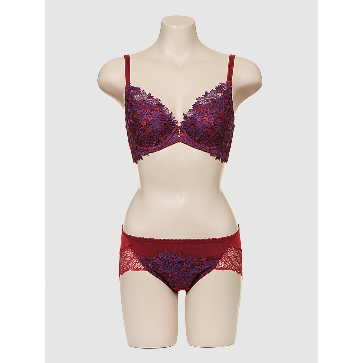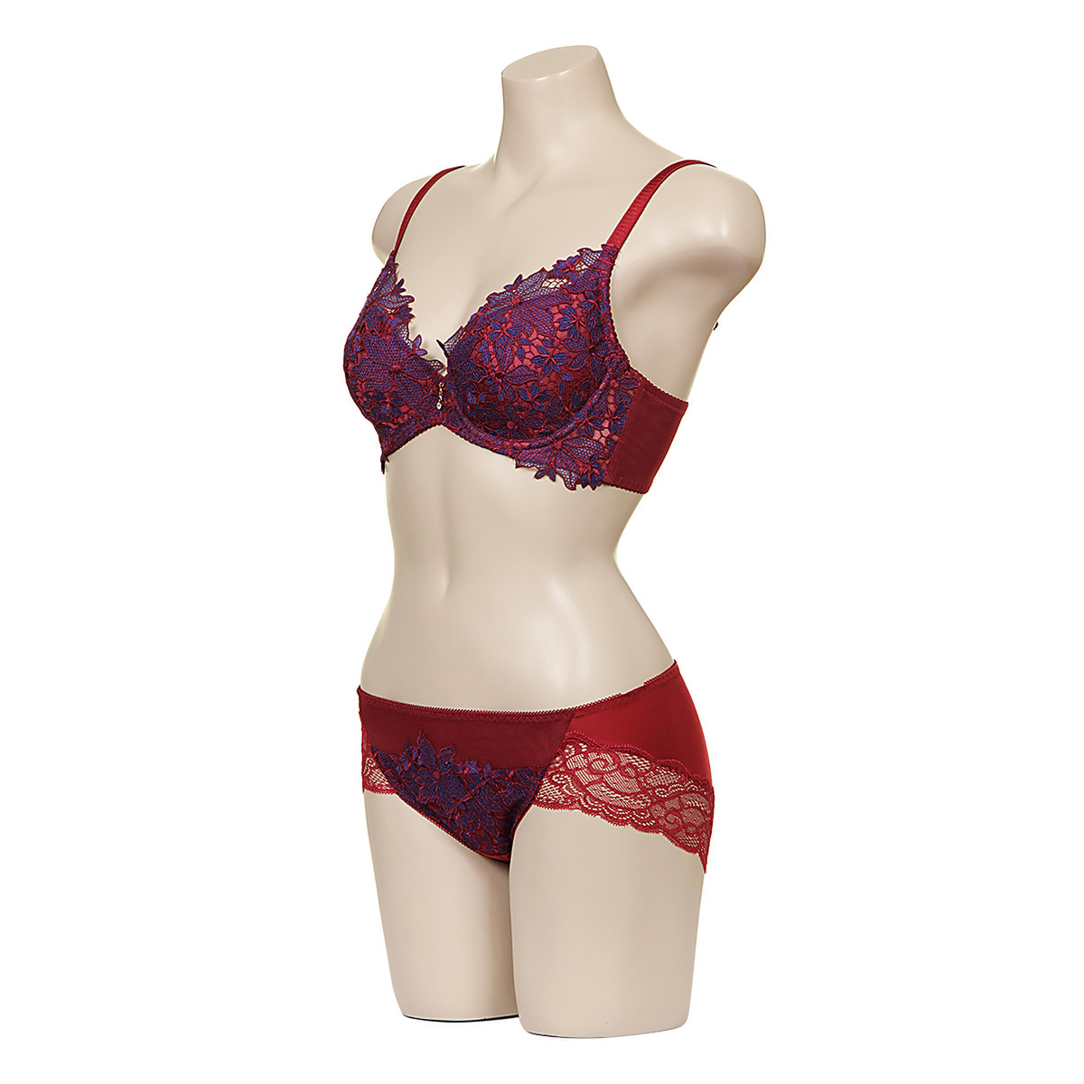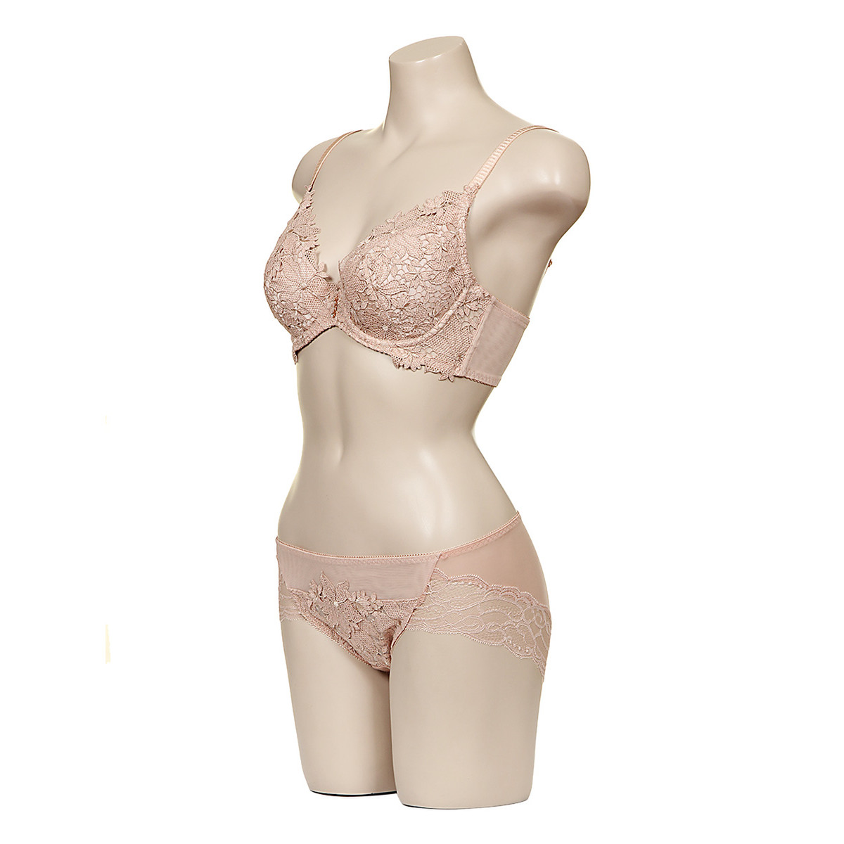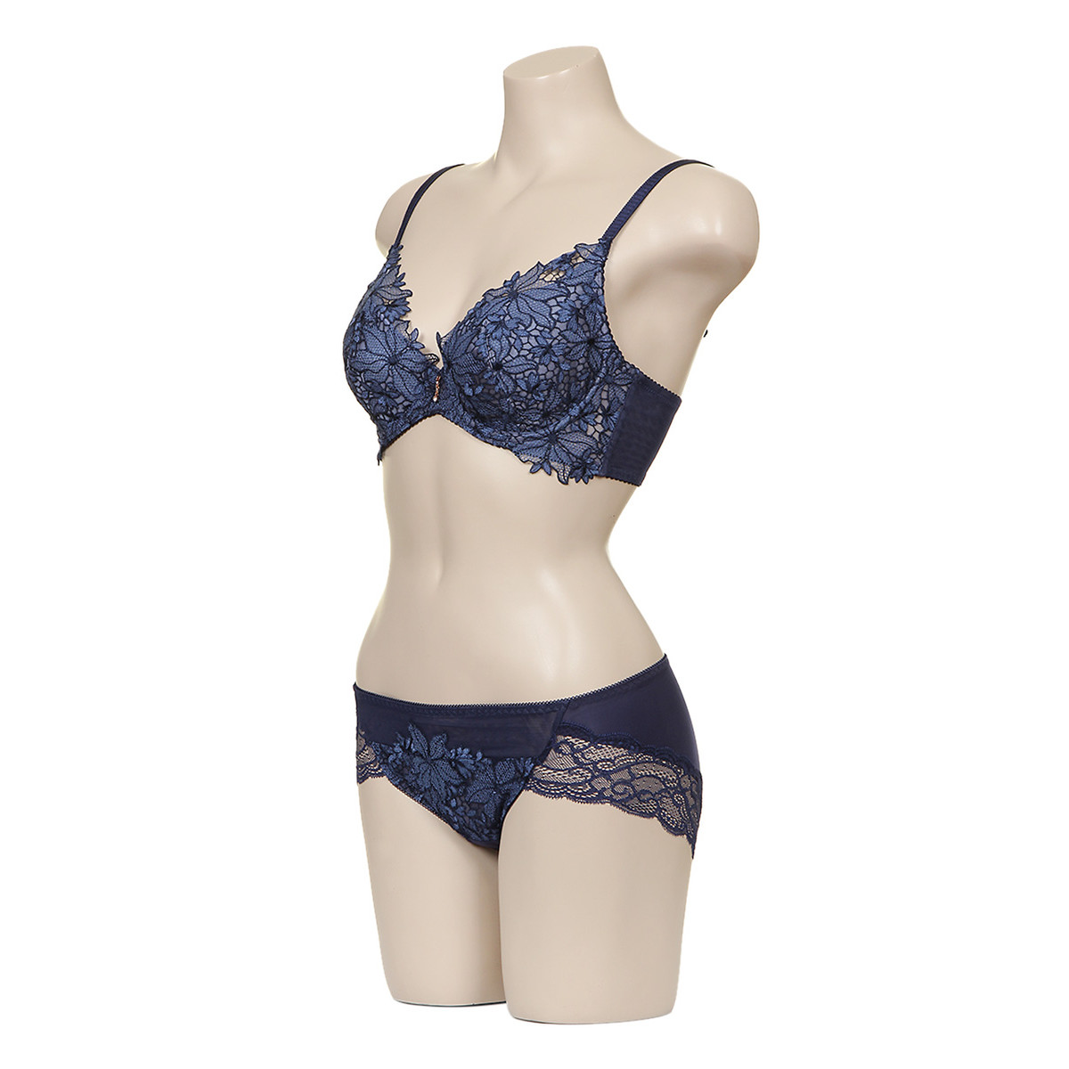 화려한 캐미컬 자수를 사용한 쿠튀르 라인 풀컵 부직포 브라와 노라인 레이스 팬티 세트입니다.