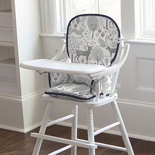 Studio : Carousel Designs Publisher : Carousel Designs Binding : Baby Product Product Description Body of high chair pad is in Gray Woodland Animals, with Solid Navy trim and Solid Cloud Gray ties. Whether it's food time or fun time, our dual-purpose high chair/child rocking chair pads are just right! Includes two pads. Top pad is 18" tall by 15" wide, bottom pad is 13" wide by 12" deep (attached arm section is 6" x 8"). Our high chair pad batting is made from recyclable hypoallergenic polyester fiberfill. Chair not included. 0