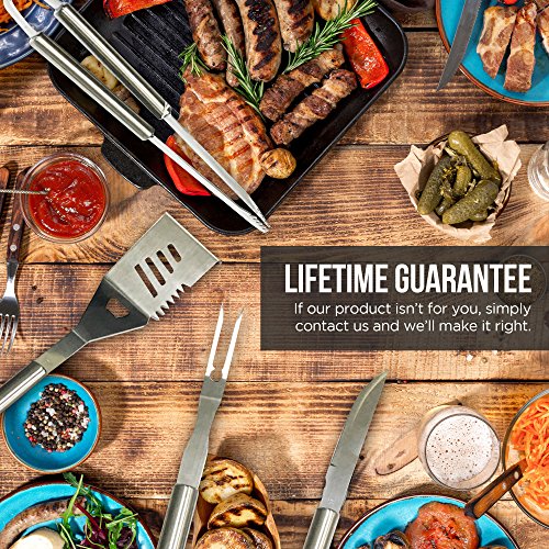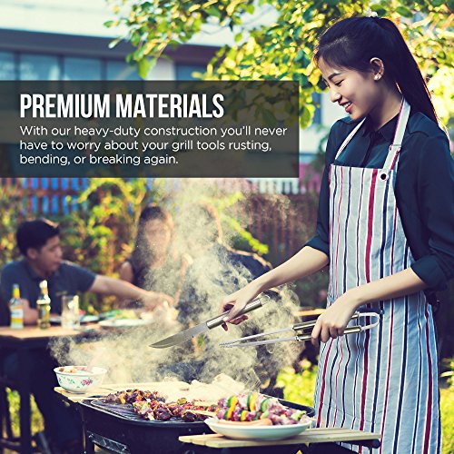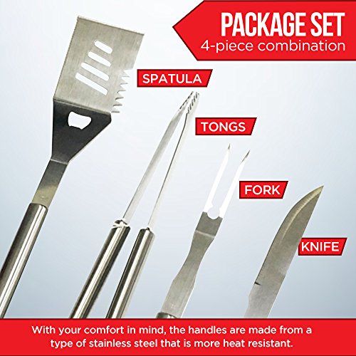 - ✔ SIZES: Spatula 18” / 9 oz, Tongs 17” / 12 oz, Fork 16” / 5 oz, Knife 17” / 5 oz (rounded); Loops for hanging
