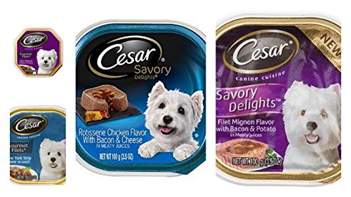 Cesar Wet Dog Food Bundle, 3.5 oz (Pack of 8) includes 2-Cups Filet Mignon Flavor with Bacon & Potato, Filet Mignon Flavor, New York Strip Flavor, Rotisserie Chicken Flavor w/ Bacon & Cheese