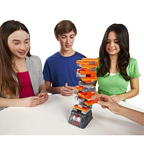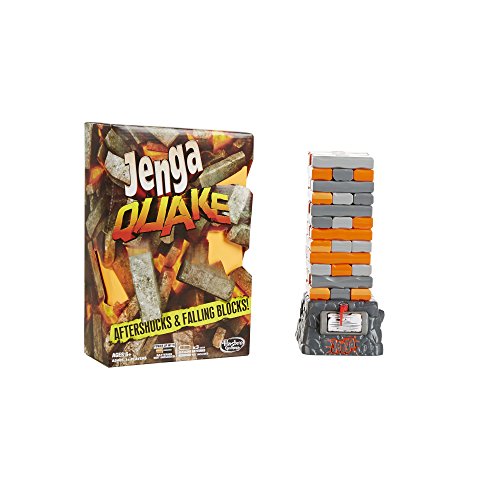 - Feature : Jenga Quake game adds a new, shaky twist to the classic game / Base vibrates randomly to shake up the game / Win by being the last one to pull out a block before the tower collapses / Includes 36 orange and gray Jenga blocks, base and instructions