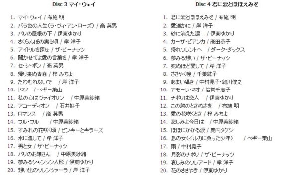 | 仕様 | ディスク枚数:5枚(全100曲) 別冊歌詞解説書(80ページ)付き、BOXケース入り 収録時間:DISC1(67:29)、DISC2(66:14)、DISC3(63:05)、DISC4(64:25)、DISC5(67:11) |