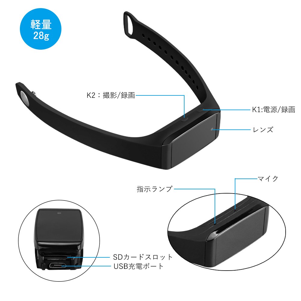 Package contents: camera, silicon band, USB charging cable, Japanese manual, storage box