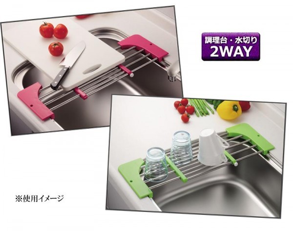 伸縮自在で、食器や野菜の水切り、まな板を乗せて調理台とシンクまわりを広く活用できます!!