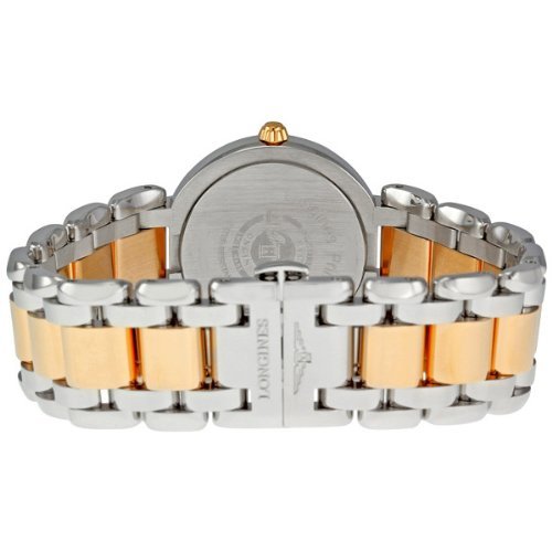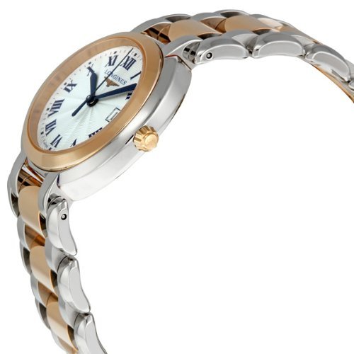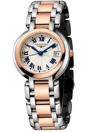 Two-tone stainless steel and 18kt rose gold case with a two-tone stainless steel and 18kt rose gold bracelet. Fixed two-tone bezel. Silver dial with blue steel hands and Roman numeral hour markers. Minute markers around the outer rim. Date display appears at the 3 o'clock position. Quartz movement. Scratch resistant sapphire crystal. Solid case back. Case diameter: 30 mm. Hidden folding clasp. Water resistant at 30 meters/ 100 feet. Functions: hours, minutes, seconds, calendar. Longines Prima Luna Quartz Ladies Watch L8.112.5.78.6.