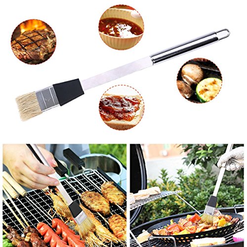Premium quality tools- This Barbecue accessories set includes 1 bbq Spatula, 1 fork,1 basting brush, 1 bbq cleaning brush, 4 corn holders. This is a complete and professional grill kit contains almost everything you need for grilling. Also tools have a loop for hanging.