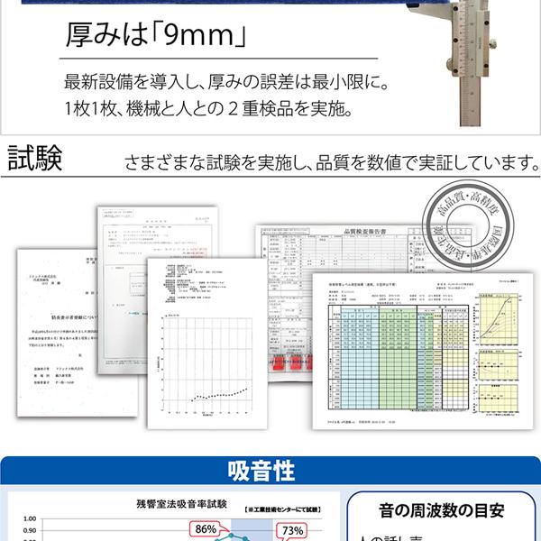 ●吸音率は2000Hz(赤ん坊や子供の泣き声程度)で86%、4000Hz(蝉の鳴き声)で73%と中~高音域で高い効果を発揮します。