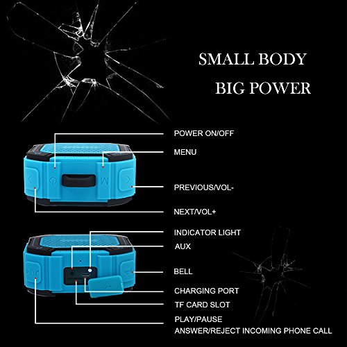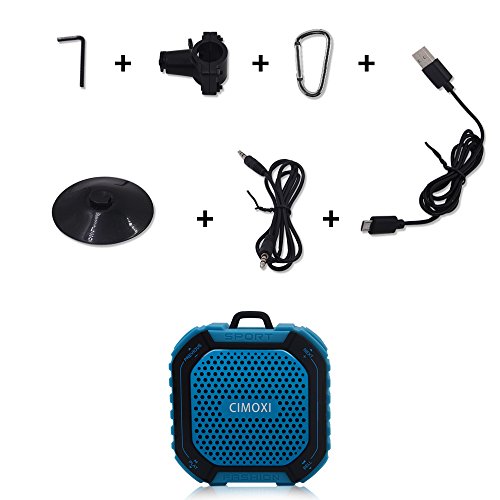 Note:? 1. Please use the adaptor (Excluded) which is 5V 1A for Charging! Do NOT use other type of adaptor, otherwise it may cause damage. 2. Please Kindly note that CAN NOT make it immersion in water. 3. It is better to charge it before using and please?charge timely and keep the item full of power when you do not use it in a long time to avoid the damage to battery. Specification: Input Voltage: DC-5V/1000mA? Power Output (RMS): 5W? Playback time: Up to 8 hours (2/3 of Maximum Volume) Charging time: 3-4 hours Battery: 3.7V/1000 mAh 1. Great for Outdoors and Shower The silicone cases and interface design ensure Shockproof, Water Resistant level up to IPX4.? 2. Enjoy Crystal Clear High Quality Sound Support A2DP and it's 5W speaker, so it delivers much louder sound than other similar outdoor speakers which is 3W output. 3. Supports hand-free communication No matter enjoy bathroom or outdoors time, the built-in high quality microphone and hands-free function can let you enjoy wonderful music without the hassle of long cable and set free your hand from?answering or end an incoming phone call.? 4. Impressive Friendly Design -Detachable suction and Aluminum alloy metal hook offer you convenience to hang and attach it to anywhere you want. 5. Automatic Power-off? -After 5 minutes without any operation since you powered on, the product will shut down automatically. What's in the box:? . CIMOXI Portabel Speaker x 1 . Bicycle Mount Kits x 1 . USB charge cable x 1 . Detachable Suction cup x 1 . 3.5mm to 3.5mm audio cable x 1 . User Manual x 1 0 |