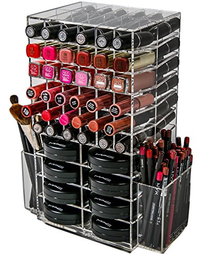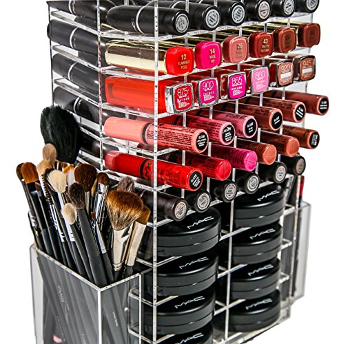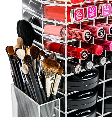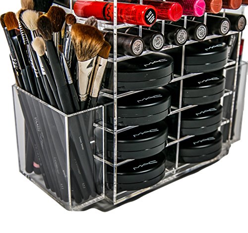 N2 Makeup Co Spinning Acrylic Makeup Organizer, Holds 72 Lipstick Holder Slots, Brushes & 16 Powder Compact Cases, Clear Cosmetics Storage Box